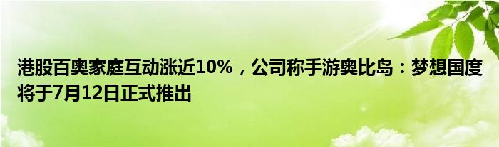 7月12日上午,港股百奥家庭互动涨近10%,百奥家庭互动公告称,手游《奥比岛:梦想国度》将于7月12日正式推出。