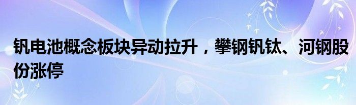 今天关于钒电池概念板块异动拉升,攀钢钒钛、河钢股份涨停这方面的信息是受到的大家的关注度比较高,很多人也是想看看钒电池概念板块异动拉升,攀钢钒钛、河钢股份涨停具体的详情,那么小编今天也是特地在网上收集了一些关于这方面的信息内容来分享给大家,大家感兴趣的话可以接着看下面的文章。