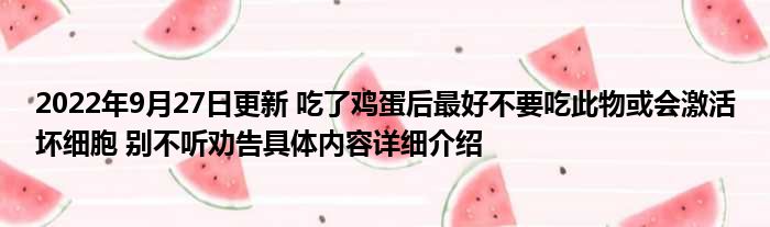 这两天关于2022年9月27日更新 吃了鸡蛋后最好不要吃此物或会激活坏细胞 别不听劝告具体内容详细介绍这方面的信息是受到的大家的关注度
