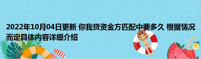 这两天关于2022年10月04日更新 你我贷资金方匹配中要多久 根据情况而定具体内容详细介绍这方面的信息是受到的大家的关注度比较高,很多