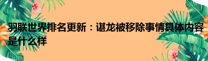 这两天关于羽联世界排名更新:谌龙被移除事情具体内容是什么样这方面的信息是受到的大家的关注度比较高,很多人也是想要明白羽联世界排名更新:谌龙被移除事情具体内容是什么样具体的详情,那么小编今天也是特地在网上收集了一些关于这方面的信息内容来分享给大家,大家感兴趣的话可以接着看下面的文章。