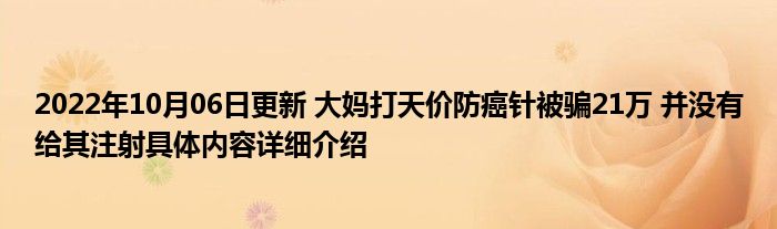 2022年10月06日更新 大妈打天价防癌针被骗21万 并没有给其注射具体内容详细介绍