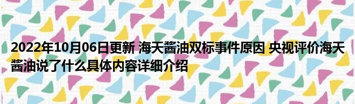 这两天关于2022年10月06日更新 海天酱油双标事件原因 央视评价海天酱油说了什么具体内容详细介绍这方面的信息是受到的大家的关注度比较