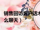 大家好,小活来为大家解答以上问题。销售回访客户话术怎么聊天,回访客户话术怎么聊天很多人还不知道,现在让我们一起来看看吧!1、回访前 浏览全文>>