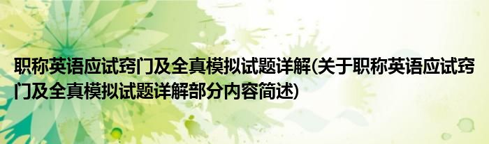 导读 大家好,今天小方来说说一篇关于职称英语应试窍门及全真模拟试题详解,关于职称英语应试窍门及全真模拟试题详解部分内容简述的文章,那么现