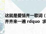 大家好,小活来为大家解答以上的问题。这就是爱情齐一歌词,歌词有一句是这样的 ldquo 唱情歌齐齐来一遍 rdquo 求歌名这个很多人还 浏览全文>>