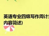 大家好,今天小方来说说一篇关于英语专业四级写作周计划,关于英语专业四级写作周计划部分内容简述的文章,那么现在就为大家来简单介绍下, 浏览全文>>