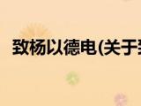 大家好,今天小方来说说一篇关于致杨以德电,关于致杨以德电部分内容简述的文章,那么现在就为大家来简单介绍下,希望对各位小伙伴们有所帮 浏览全文>>