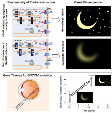 高达 20% 的 LCA 病例是由 GUCY2D 突变引起的,GUCY2D 是一种编码视网膜感光细胞所需的关键蛋白的基因,该蛋白用于“光转导级联”——将光转换为神经元信号的过程。先前的影像学研究表明,患有这种形式的 LCA 的患者往往具有相对保留的感光细胞,特别是在富含视杆的区域,这暗示如果存在功能性 GUCY2D,基于视杆的光转导可以再次起作用。去年报道的低剂量基因治疗的早期结果与这一想法一致。