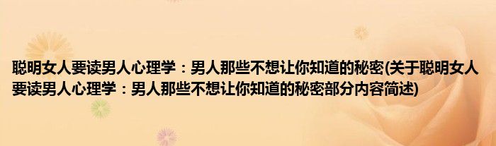 导读 大家好,今天小方来说说一篇关于聪明女人要读男人心理学:男人那些不想让你知道的秘密,关于聪明女人要读男人心理学:男人那些不想让你知道