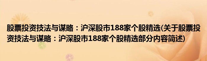 大家好,今天小方来说说一篇关于股票投资技法与谋略:沪深股市188家个股精选,关于股票投资技法与谋略:沪深股市188家个股精选部分内容简述的文章,那么现在就为大家来简单介绍下,希望对各位小伙伴们有所帮助。