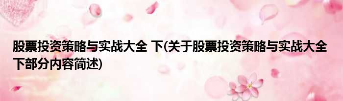 导读 大家好,今天小方来说说一篇关于股票投资策略与实战大全 下,关于股票投资策略与实战大全 下部分内容简述的文章,那么现在就为大家来简单