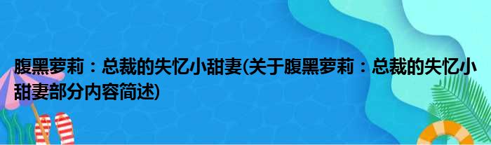 导读 大家好,今天小方来说说一篇关于腹黑萝莉:总裁的失忆小甜妻,关于腹黑萝莉:总裁的失忆小甜妻部分内容简述的文章,那么现在就为大家来简单