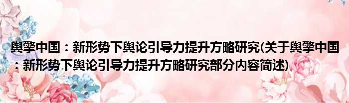 导读 大家好,今天小方来说说一篇关于舆擎中国:新形势下舆论引导力提升方略研究,关于舆擎中国:新形势下舆论引导力提升方略研究部分内容简述的