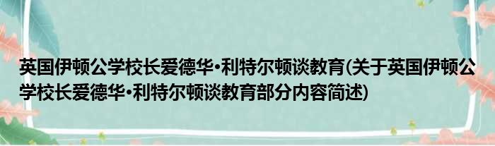 导读 大家好,今天小方来说说一篇关于英国伊顿公学校长爱德华·利特尔顿谈教育,关于英国伊顿公学校长爱德华·利特尔顿谈教育部分内容简述的文章