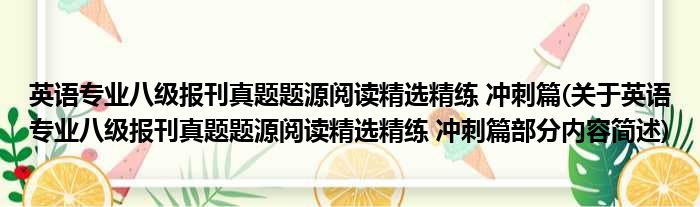 1、 英语专业八级报刊真题题源阅读精选精练《英语专业八级报刊真题题源阅读精选精练(冲刺篇)》[1]共分为基础、提高、冲刺三个系列,文章按难度进行了分级排列,在让读者从基础做起、逐步积累、有成就感的同时,还便于读者按照自己的英语程度,从最适合自已的难度入手,逐步提高。