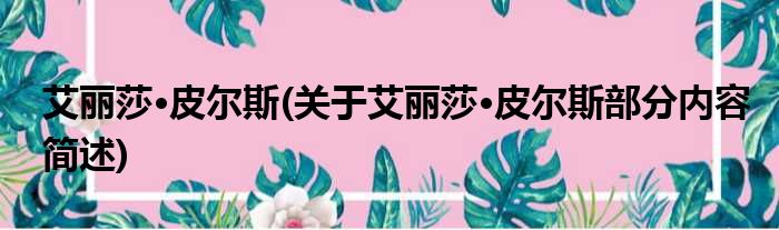 导读 大家好,今天小方来说说一篇关于艾丽莎·皮尔斯,关于艾丽莎·皮尔斯部分内容简述的文章,那么现在就为大家来简单介绍下,希望对各位小伙伴