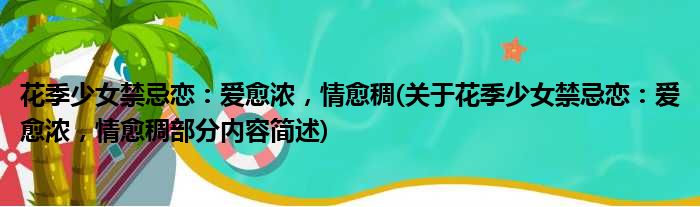 大家好,今天小方来说说一篇关于花季少女禁忌恋:爱愈浓,情愈稠,关于花季少女禁忌恋:爱愈浓,情愈稠部分内容简述的文章,那么现在就为大家来简单介绍下,希望对各位小伙伴们有所帮助。