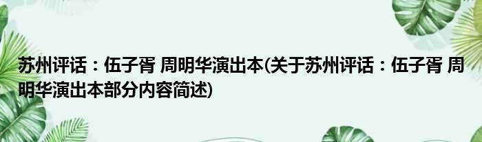 导读 大家好,今天小方来说说一篇关于苏州评话:伍子胥 周明华演出本,关于苏州评话:伍子胥 周明华演出本部分内容简述的文章,那么现在就为大
