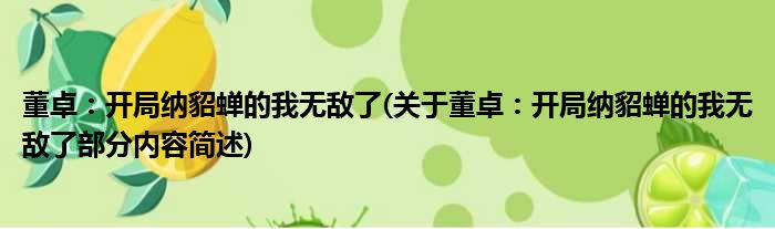 大家好,今天小方来说说一篇关于董卓:开局纳貂蝉的我无敌了,关于董卓:开局纳貂蝉的我无敌了部分内容简述的文章,那么现在就为大家来简单介绍下,希望对各位小伙伴们有所帮助。