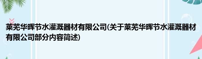莱芜华晖节水灌溉器材有限公司(关于莱芜华晖节水灌溉器材有限公司部分内容简述)