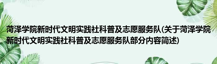 导读 大家好,今天小方来说说一篇关于菏泽学院新时代文明实践社科普及志愿服务队,关于菏泽学院新时代文明实践社科普及志愿服务队部分内容简述的