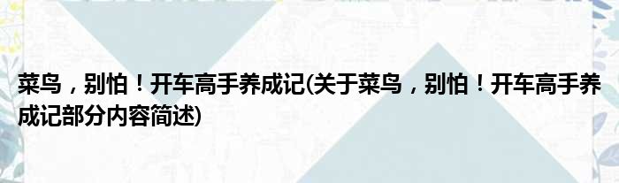 导读 大家好,今天小方来说说一篇关于菜鸟,别怕!开车高手养成记,关于菜鸟,别怕!开车高手养成记部分内容简述的文章,那么现在就为大家来简单