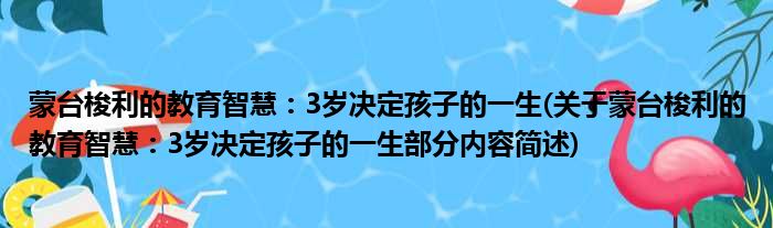 导读 大家好,今天小方来说说一篇关于蒙台梭利的教育智慧:3岁决定孩子的一生,关于蒙台梭利的教育智慧:3岁决定孩子的一生部分内容简述的文章,