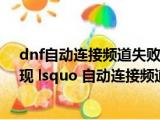 大家好,小东方来为大家解答以上的问题。dnf自动连接频道失败连接至可登陆的频道,dnf更新后出现 lsquo 自动连接频道失败 rsquo 怎么办 浏览全文>>
