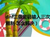 大家好,小东方来为大家解答以上的问题。dnf二级密码输入三次错误,DNF二级密码输入3次错误被限制 怎么解决这个很多人还不知道,现在让我们 浏览全文>>