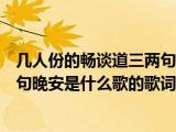 大家好,小东方来为大家解答以上的问题。几人份的畅谈道三两句晚安什么歌曲,几人份的畅谈道三两句晚安是什么歌的歌词这个很多人还不知道,现 浏览全文>>