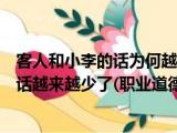 大家好,小东方来为大家解答以上的问题。客人和小李的话为何越来越少,你认为客人为什么和小李的话越来越少了(职业道德 职业素养这个很多人 浏览全文>>