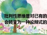 大家好,小东方来为大家解答以上的问题。批判性思维是对已有的观点,3 判断题 批判性思维有时候会转变为一种论辩式的思维 ()这个很 浏览全文>>