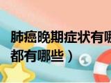 大家好,小东方来为大家解答以上的问题。肺癌晚期症状是什么,肺癌晚期症状这个很多人还不知道,现在让我们一起来看看吧!1、一 肺癌早期症状 浏览全文>>