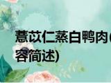 大家好,今天小方来说说一篇关于薏苡仁蒸白鸭肉,关于薏苡仁蒸白鸭肉部分内容简述的文章,那么现在就为大家来简单介绍下,希望对各位小伙伴 浏览全文>>