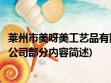 大家好,今天小方来说说一篇关于莱州市美呀美工艺品有限公司,关于莱州市美呀美工艺品有限公司部分内容简述的文章,那么现在就为大家来简单 浏览全文>>