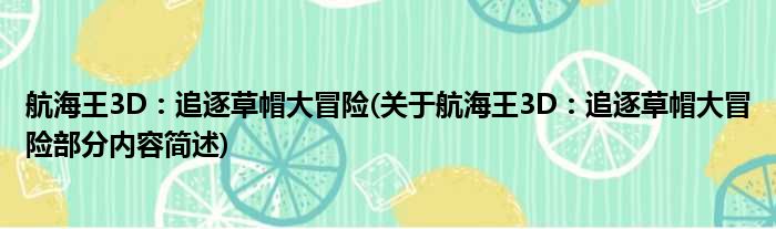 1、 《航海王3D:追逐草帽大冒险》是经典动画《海贼王》系列的第11部剧场版作品,也是首度采用3D电影制作技术,完整立体呈现草帽海贼团的精彩冒险故事。