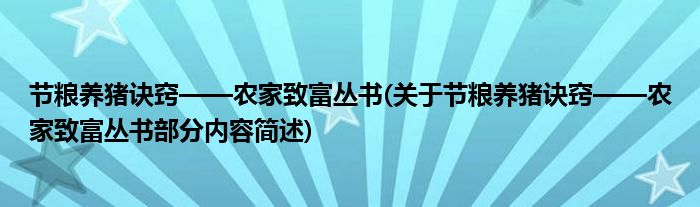 1、 《节粮养猪诀窍——农家致富丛书》是2005年广西科学技术出版社出版的图书。本书采用陈述式、问答式、图谱式、图说式(连环画式)等写作方式,分门别类地介绍了粮食作物、经济作物、果树、蔬菜等丰产栽培、病虫害防治技术,以及畜牧兽医、水产养殖、农副产品加工等诸方面内容。