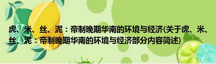 虎、米、丝、泥:帝制晚期华南的环境与经济(关于虎、米、丝、泥:帝制晚期华南的环境与经济部分内容简述)