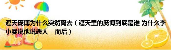 大家好,小东方来为大家解答以上的问题。遮天庞博为什么突然离去,遮天里的庞博到底是谁 为什么李小曼说他说恶人 而后这个很多人还不知道,现在让我们一起来看看吧!