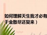 大家好,小东方来为大家解答以上的问题。如何理解天生我才必有用千金散尽还复来,天生我才必有用千金散尽还复来这个很多人还不知道,现在让我 浏览全文>>