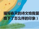 大家好,小东方来为大家解答以上的问题。描写春天的诗文给我留下了什么样的印象,描写春天的诗文给下了怎么样的印象这个很多人还不知道,现在 浏览全文>>