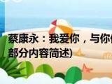大家好,今天小方来说说一篇关于蔡康永:我爱你,与你何干,关于蔡康永:我爱你,与你何干部分内容简述的文章,那么现在就为大家来简单介绍 浏览全文>>