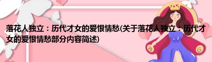 导读 大家好,今天小方来说说一篇关于落花人独立:历代才女的爱恨情愁,关于落花人独立:历代才女的爱恨情愁部分内容简述的文章,那么现在就为大