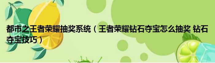 导读 大家好,小东方来为大家解答以上的问题。都市之王者荣耀抽奖系统,王者荣耀钻石夺宝怎么抽奖 钻石夺宝技巧这个很多人还不知道,现在让我们一